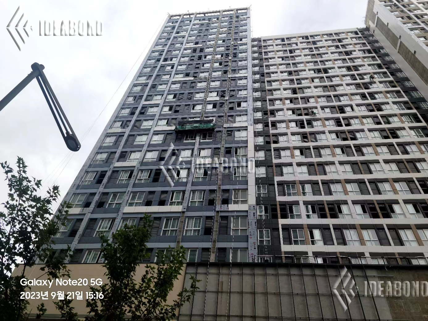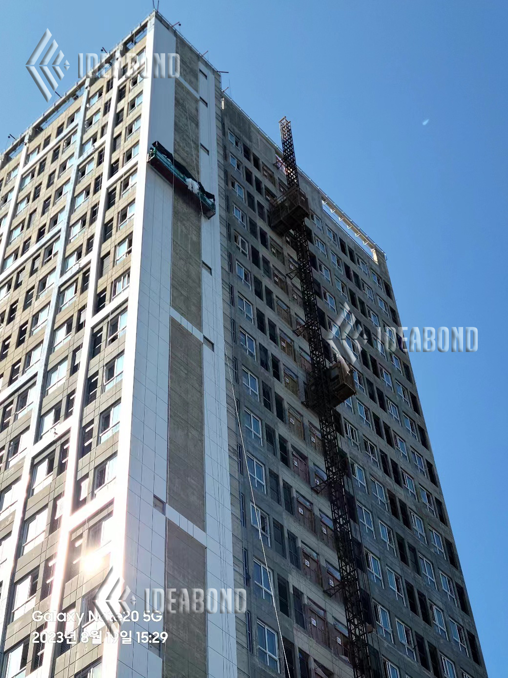 这是位于韩国的一处生活型住宿公寓,该项目总建筑面积41,576㎡,采用了雅达利b1级防火铝复合板作为建筑外墙装饰板。为了达到***的建筑装饰效果,铝塑板的颜色选择了af-404氟碳哑白和af-410鼠灰两种配色。铝塑板的尺寸为1220*2440mm,板材厚度为4mm,铝材厚度为0.50mm。