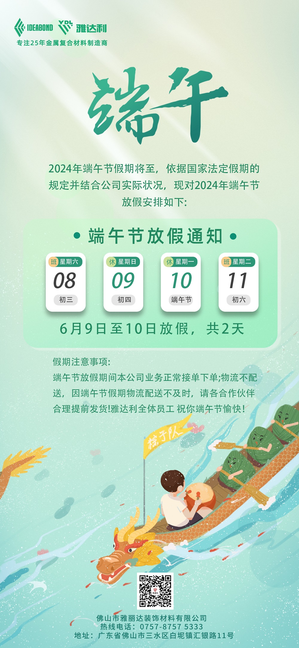 您好!2024 年端午节即将来临,根据国家法定假期的规定,并结合我公司实际情况,现对 2024 年端午节放假安排通知如下: