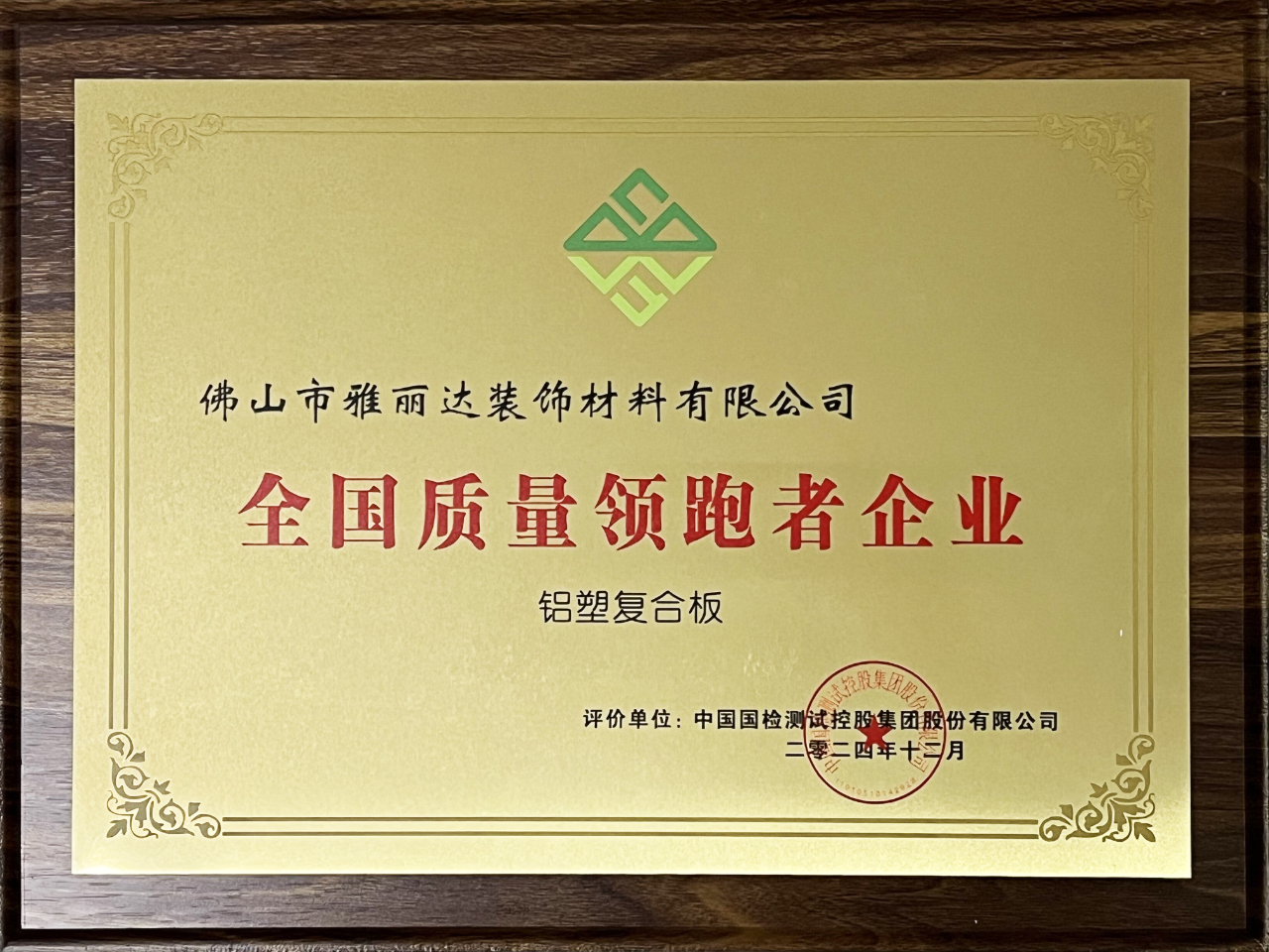 2024 年,金属复合装饰材料行业年会暨第十届行业创新论坛在浙江宁波盛大召开,主题为 “搭台建链・碳索未来”。此次大会强调加强行业自律、强化自主创新,全力推进***绿色转型。会上,佛山市雅丽达装饰材料有限公司及产品(铝塑复合板)荣获 “全国质量领跑者企业” 称号。这项荣誉不仅是对雅丽达长期以来坚持品质***、绿色发展的肯定,也是对雅丽达在业内稳健发展的认可。